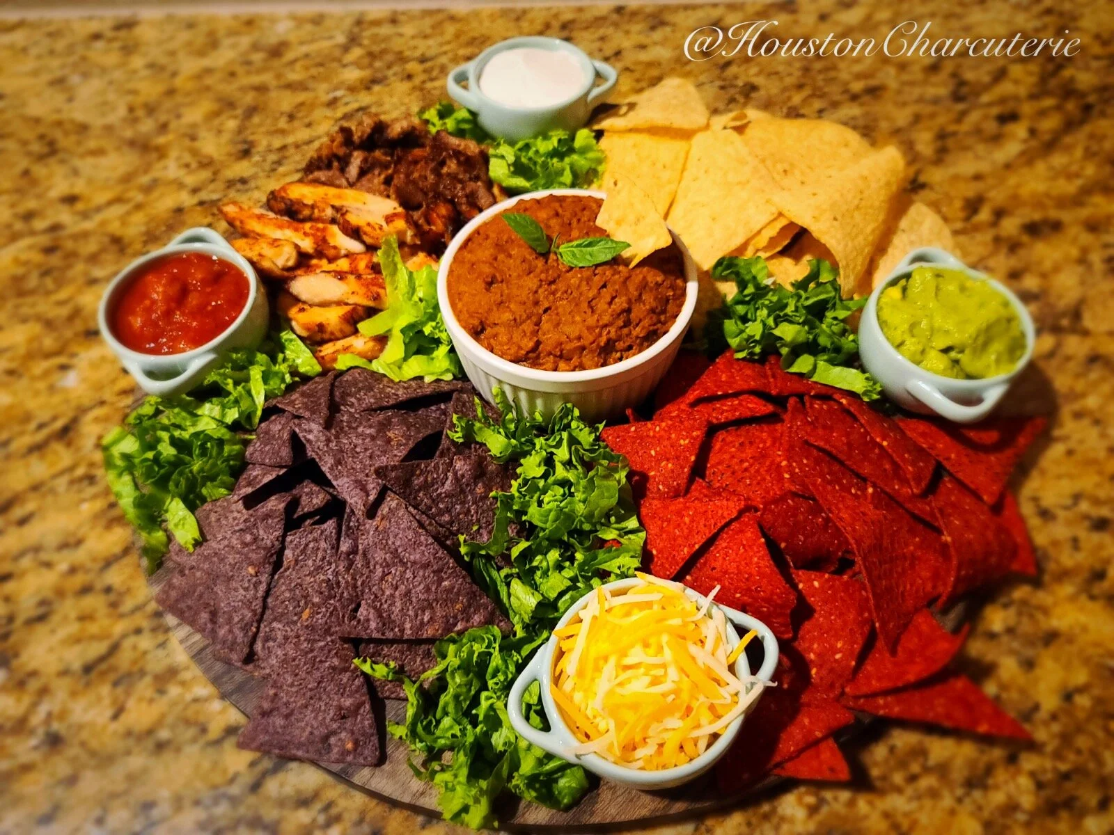 The small board includes 2 meats, 2 cheeses, fruit, crackers, & nuts. Perfect for a small group of up to 3 people!